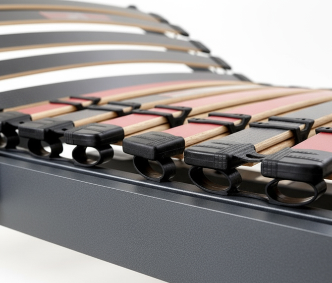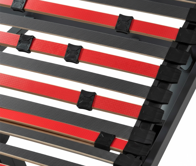 Sistema multilaminar com ripas de madeira com peso flexível e ripas duplas com reguladores de firmeza na zona lombar, facilitando a adaptabilidade do usuário. Suportes laterais de de alta suspensão unem o sistema multilaminar à estrutura interna, garantindo uma articulação perfeita e um descanso silencioso.
