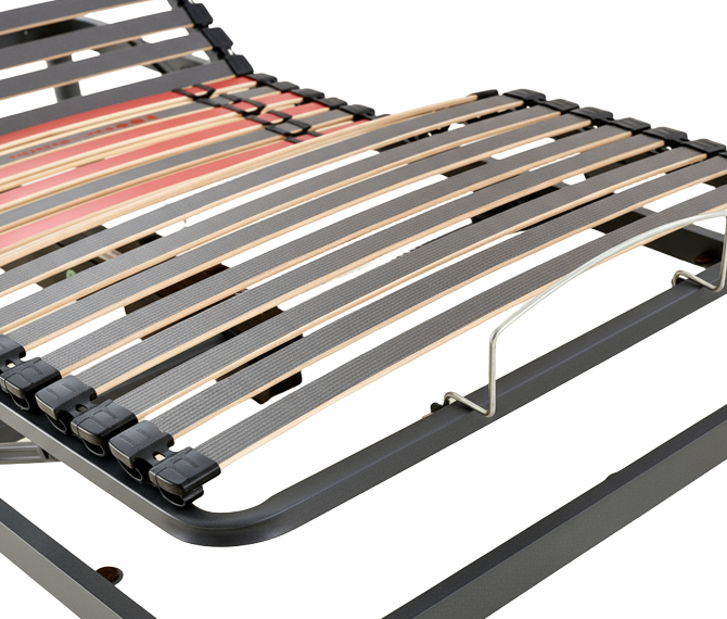 Este estrado possui lâminas de faia vaporizada, fixadas ao bastidor por meio de tacos de alta suspensão. Conta com reguladores de firmeza na zona lombar, proporcionando grande comodidade nessa área. Cada zona pode ser acionada de forma independente: pés e cabeceira. O aro metálico na parte dos pés evita qualquer deslocamento do colchão. Pés incluídos.