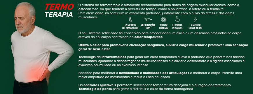 - Controlo remoto para ajustar as funcionalidades da poltrona com facilidade.